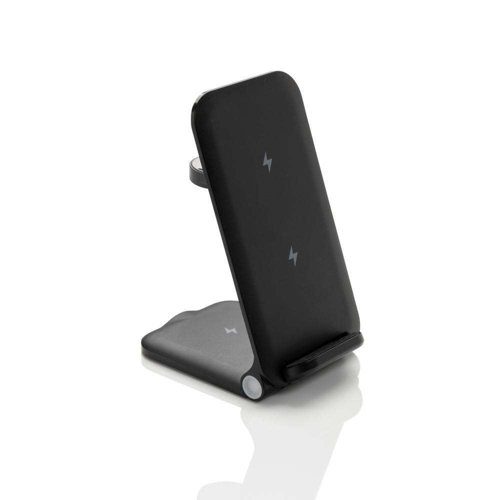 Ontdek deze veelzijdige 3-in-1 draadloze opladerstand, perfect als gepersonaliseerd relatiegeschenk voor jouw marketingacties of events. Je laadt moeiteloos je smartphone op tot 15W, earbuds-cases tot 5W en Apple Watch tot 2.5W – allemaal tegelijk en zonder kabels te wikkelen.