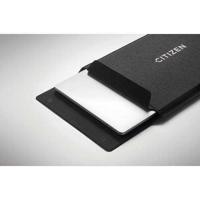 3 in 1 16 inch RPET-laptophoes met laptopstandaard en muismatfunctie wanneer deze is uitgevouwen.