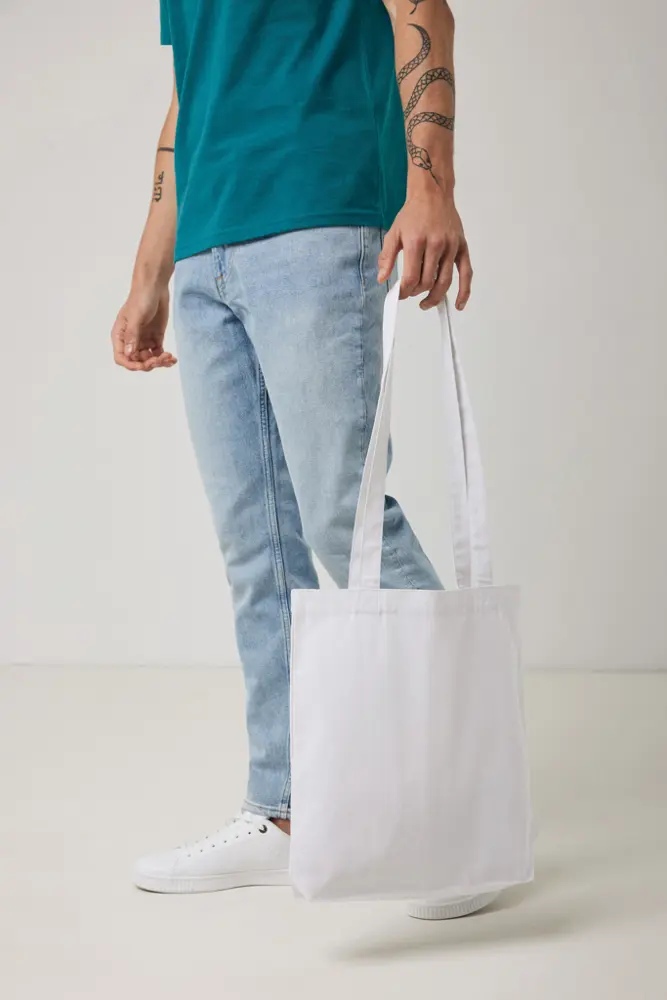 Ontdek de Quato draagtas van 330 g/m² gerecycled katoen, een duurzame keuze voor uw marketingacties en events. Dankzij AWARE™ technologie wordt het gebruik van gerecycled materiaal geverifieerd via tracer- en blockchain-technologie, met bewezen lagere milieu-impact. Deze casual tas, met een inhoud van 9,8 liter en afmetingen van 400 x 60 x 370 mm, biedt voldoende ruimte voor essentials en is herbruikbaar voor dagelijks gebruik.