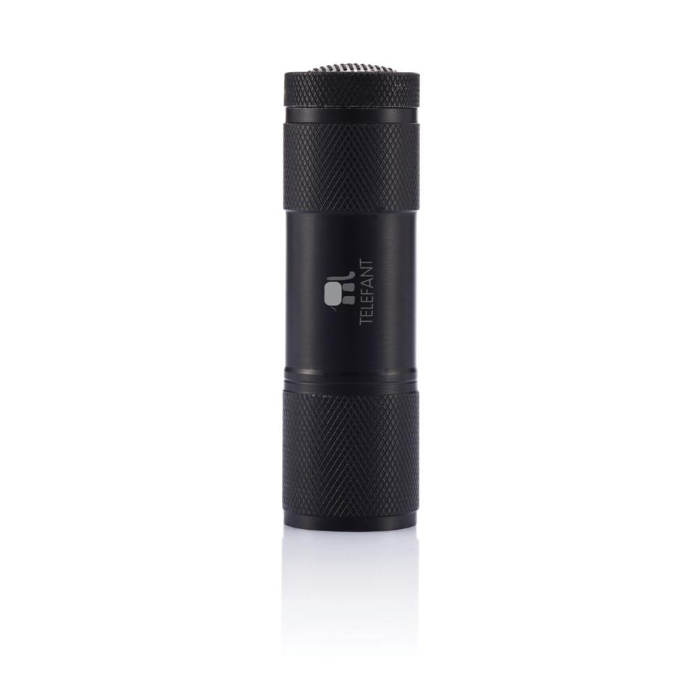 De Quattro zaklamp is een compacte aluminium lamp met 9 krachtige witte LEDs, ideaal als gepersonaliseerd relatiegeschenk met jouw logo.