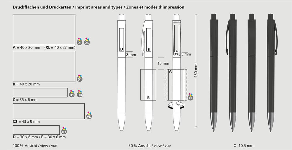 De Qube high gloss Mn is een Drukknop-balpen. Materialen en oppervlakken: Punt: Messing vernikkeld. Schacht, bovendeel en drukknop: Kunststof (ABS) hoogglanzend. Navulbuis: Gerecycled polypropyleen (rPP). Standaard kleuren: Schacht, bovendeel en drukknop: te combineren uit 14 kleuren. : vanaf 5000 stuks; vanaf 25.000 stuks zonder PMS-toeslag. Standaard vulling: Silktech L (3 000 m), blauw of zwart, vulling optioneel: Silktech XL, Multifill P, Multi-Gel.