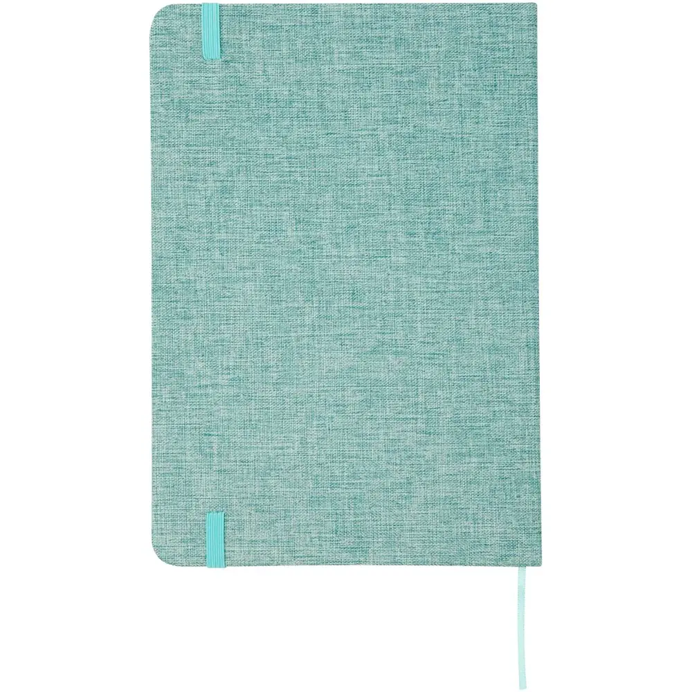 Ontdek het Ramona A5 notitieboek van gerecycled katoen, uw ideale duurzame relatiegeschenk voor marketingcampagnes en events. Met een harde kaft van gerecycled katoen en 80 gelinieerde vellen FSC-gecertificeerd papier van 70 g/m² (maat 21,1 x 14,5 cm) biedt dit notitieboek optimale schrijfcomfort en bescherming. De elastische sluiting, ingebonden lint en afgeronde hoeken zorgen voor gebruiksgemak en een professionele uitstraling.