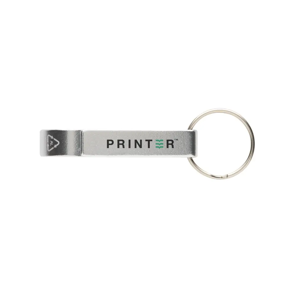 Ontdek deze veelzijdige fles- en blikopener in de vorm van een sleutelhanger, perfect als gepersonaliseerd relatiegeschenk. Gemaakt van RCS-gerecycled aluminium met een totaal gerecycled materiaalpercentage van 79% op basis van het totale gewicht. De RCS-certificering garandeert een transparante en volledig gecertificeerde toeleveringsketen voor de gerecyclede materialen, wat uw merk positioneert als leider in duurzaamheid.