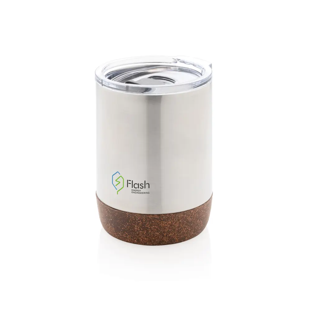 Ontdek onze roestvrijstalen koffiebeker met kurk, ideaal als gepersonaliseerd relatiegeschenk voor uw marketingacties of events. Deze vacuüm geïsoleerde mok houdt uw drankjes tot 5 uur warm en tot 15 uur koud, zodat uw relaties altijd genieten van een perfect getemperde koffie of thee. Met een uniek kurkdetail en een capaciteit van 180 ml past hij naadloos op de meeste koffiemachines, wat hem praktisch maakt voor dagelijks gebruik.
