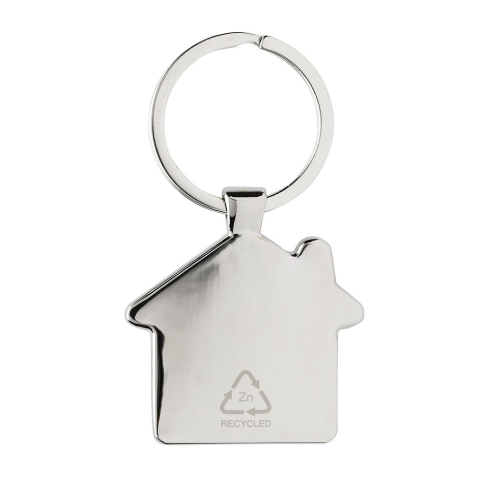 Huisvormige sleutelhanger gemaakt van RCS-gerecyclede zinklegering en bamboe. Totaal gerecycled materiaal: 76% op basis van het totale gewicht van het item. RCS-certificering zorgt voor een volledig gecertificeerde toeleveringsketen van de gerecyclede materialen. Verpakt in papieren zak.