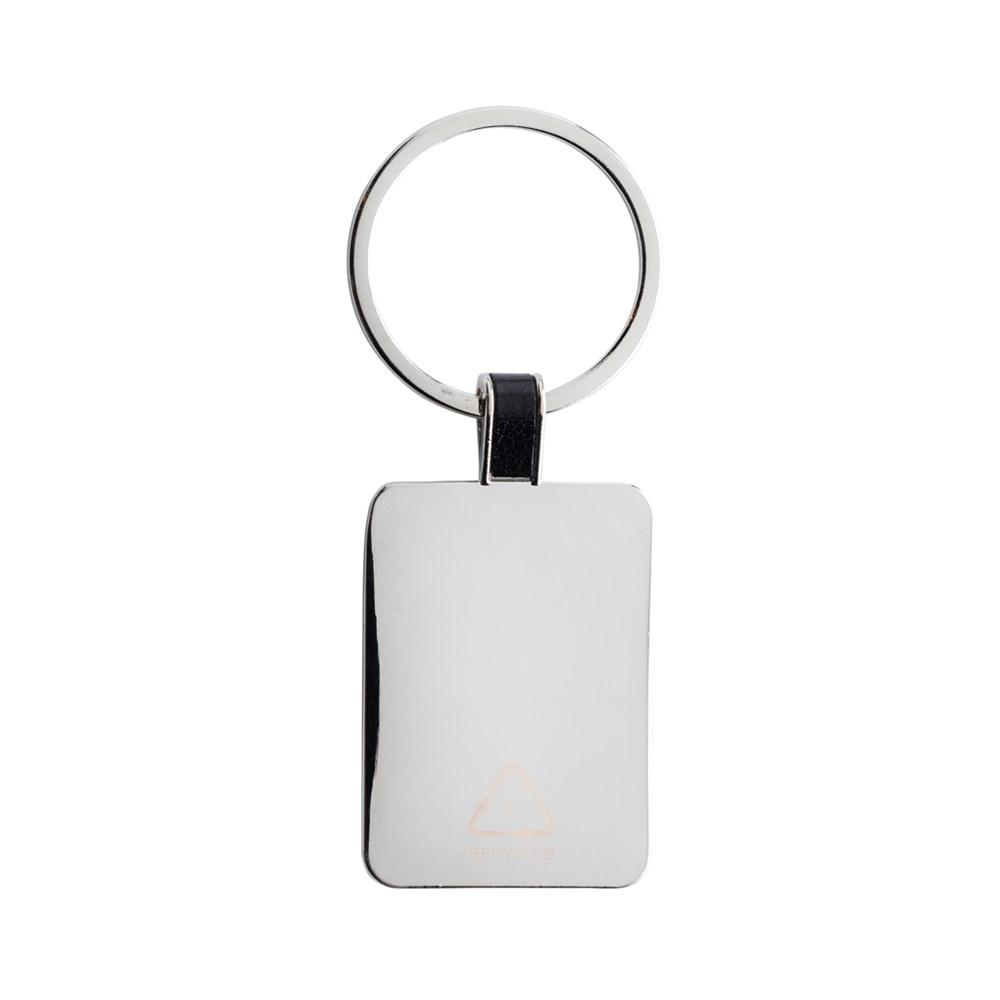 Rechthoekige sleutelhanger gemaakt van RCS gerecyclede zinklegering. Totaal gerecycled materiaal: 84% op basis van het totale gewicht van het item. RCS-certificering zorgt voor een volledig gecertificeerde toeleveringsketen van de gerecycled materialen. Verpakt in papieren zak
