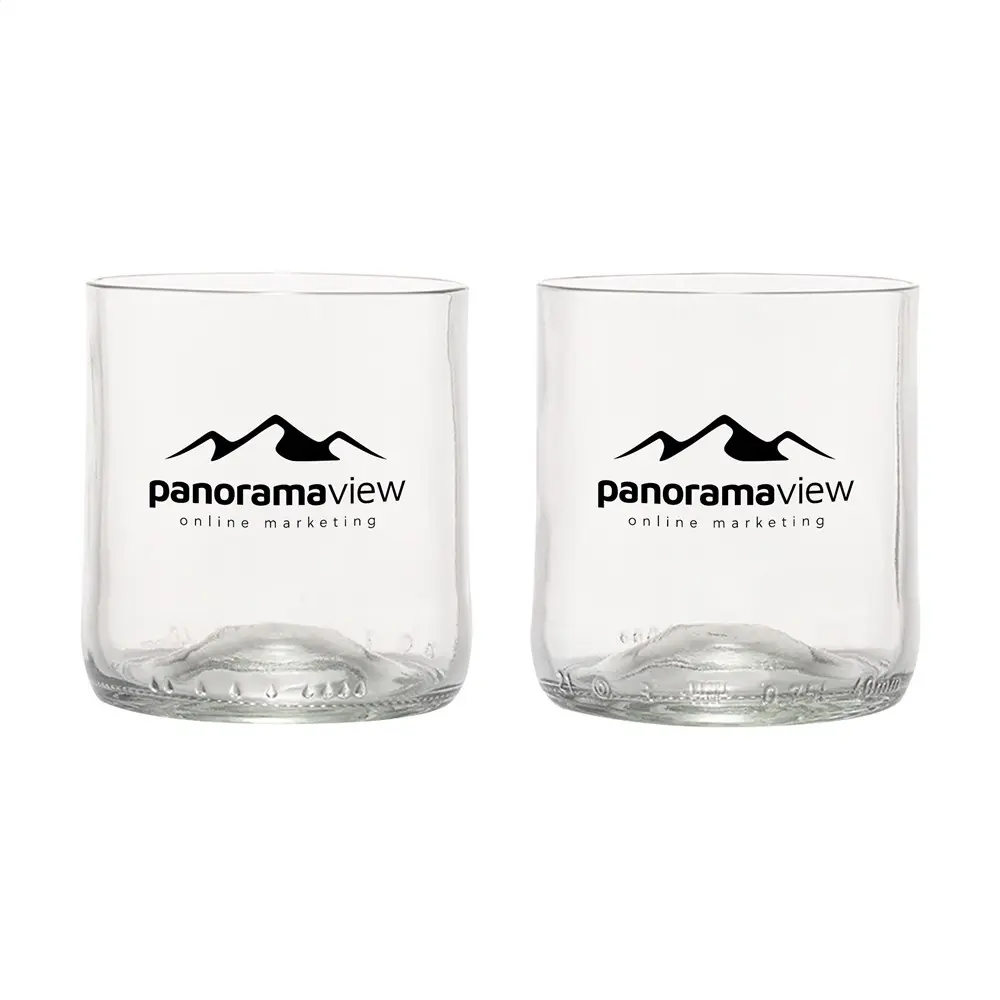 Ontdek de Rebottled® Short Tumbler 2-pack set glazen, vervaardigd uit geupcyclede wijnflessen. Deze unieke design drinkglazen behouden de herkenbare vorm van de oorspronkelijke fles, bieden een comfortabele grip en een gladde afwerking. Gemaakt van hoogwaardig glas met een inhoud van circa 250 ml per glas, zijn ze ideaal voor water, sap of wijn. De set wordt geleverd in een originele geschenkverpakking van gerecycled karton, perfect voor uw events of als duurzame relatiegeschenken.