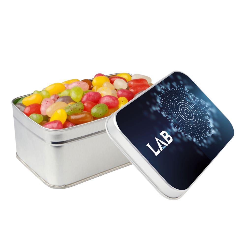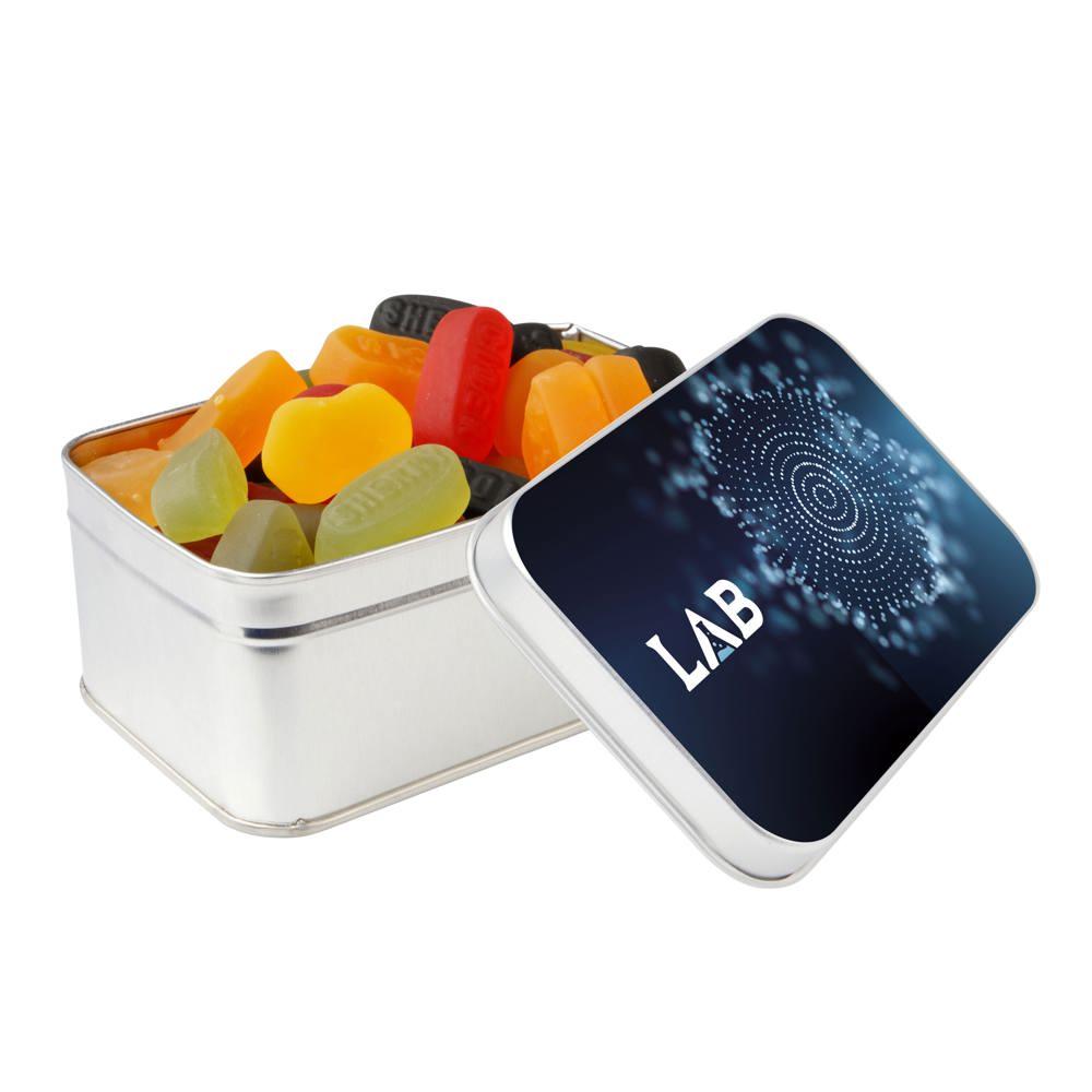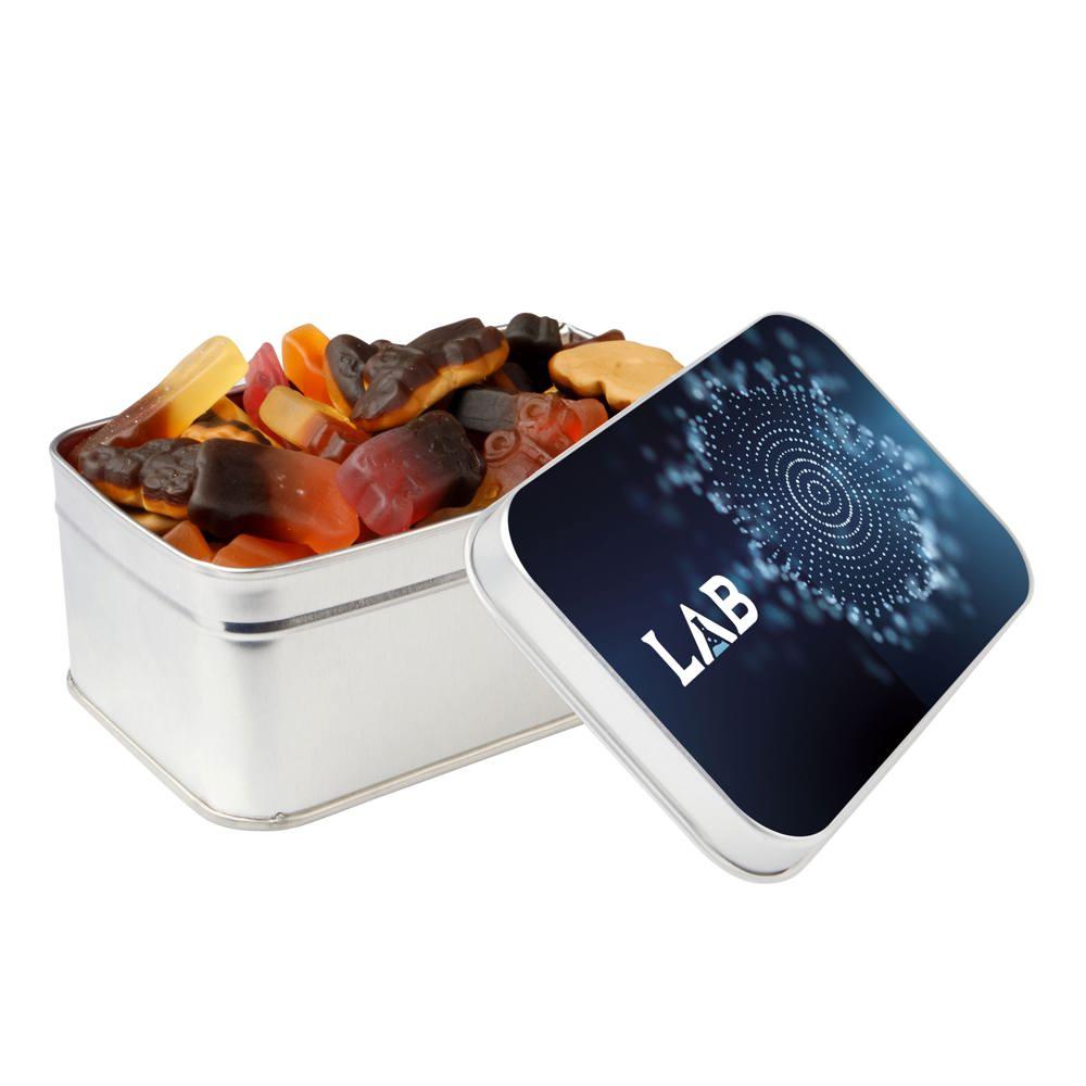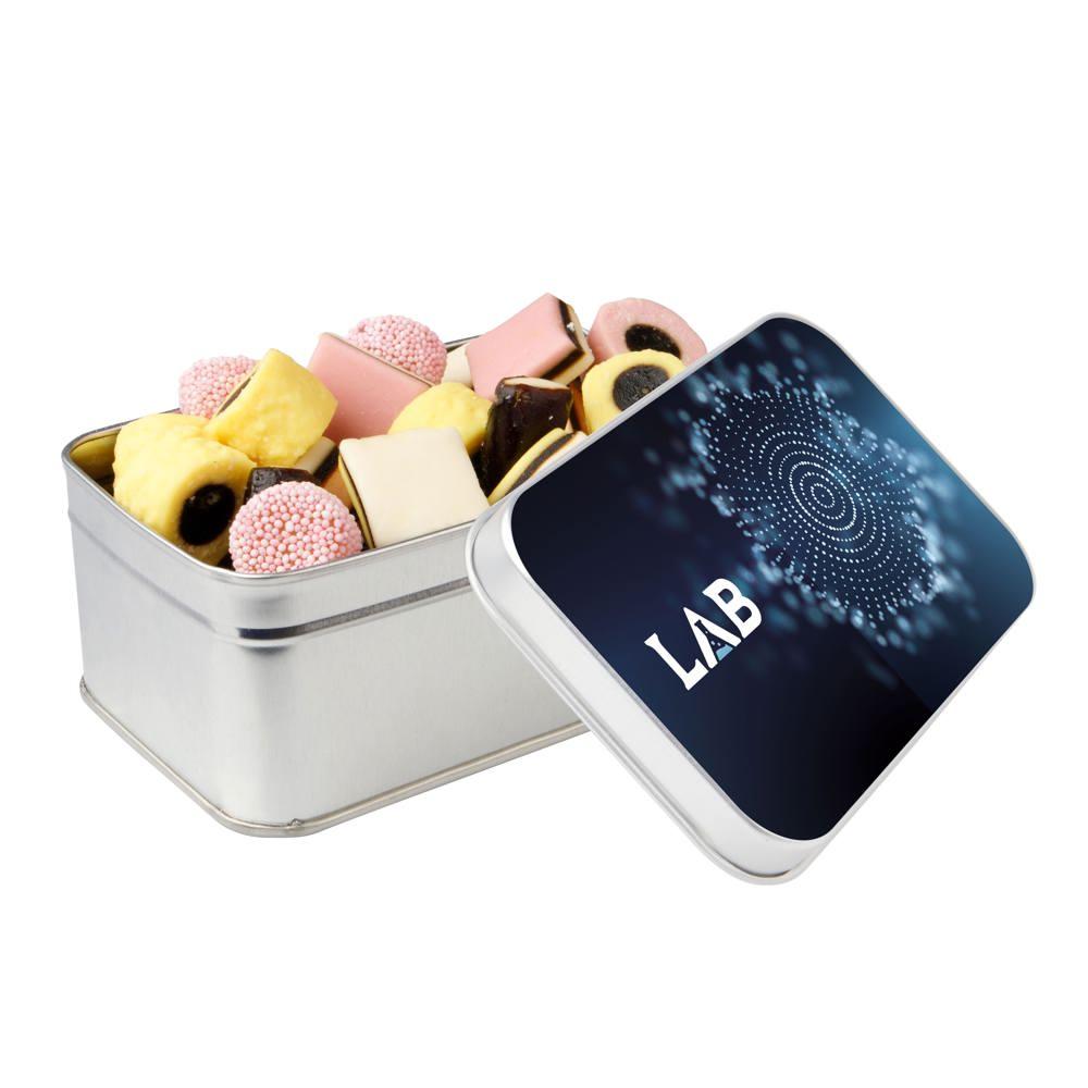 Rechthoekig blik gevuld met ca. 140 gram Metallic sweets en voorzien van een full colour bedrukking op het deksel