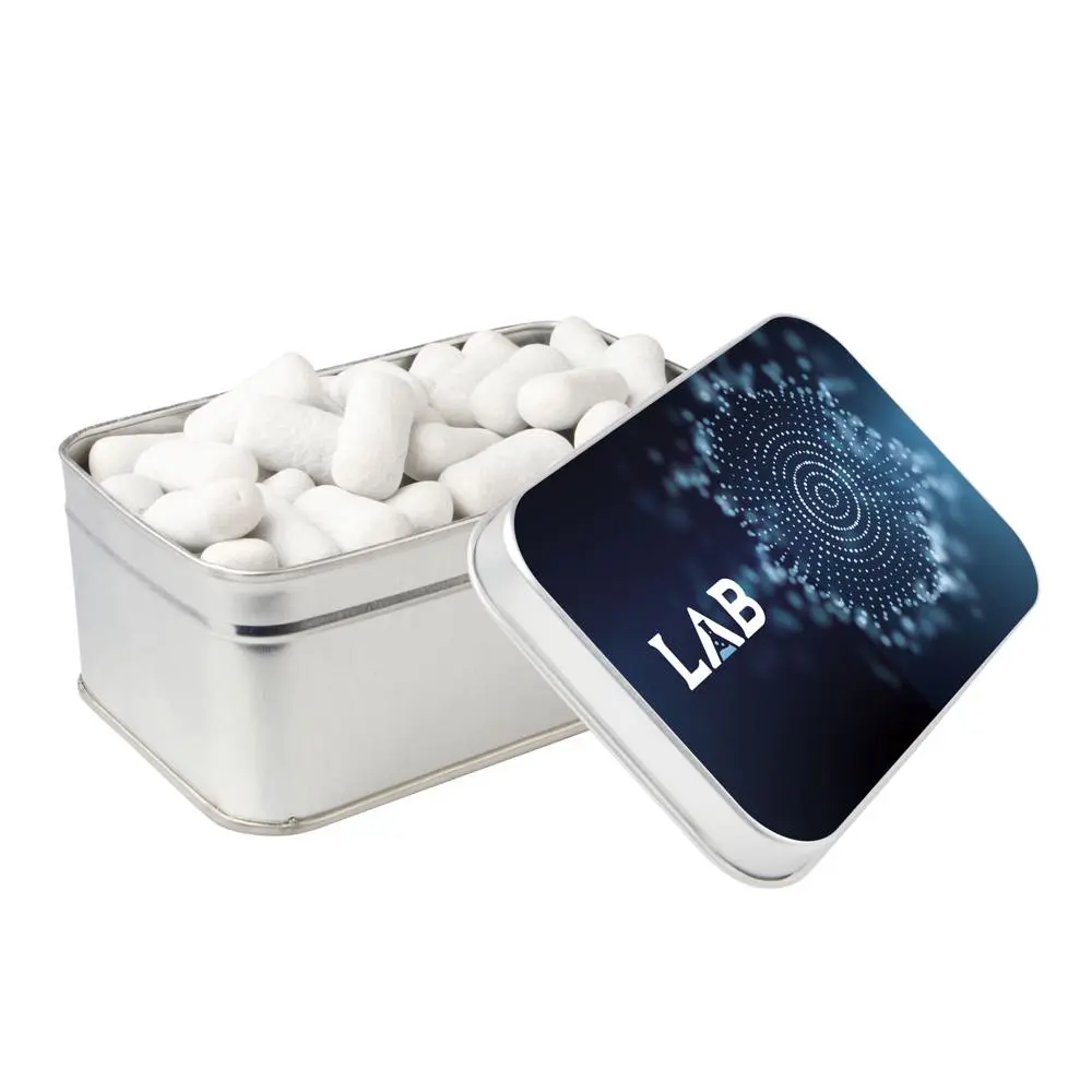 Dit rechthoekige blik, gemaakt van stevig blik, bevat ongeveer 140 gram metallic snoepjes. Het deksel is voorzien van een full colour bedrukking, ideaal voor uw logo of merkdesign.