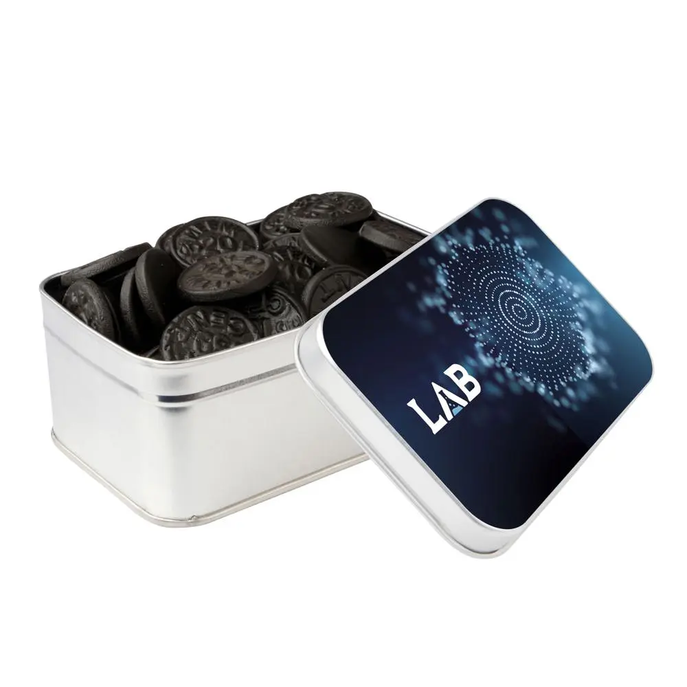 Dit rechthoekige blik, gevuld met circa 140 gram metallic snoepjes, biedt uw merk een unieke manier om op te vallen. Gemaakt van stevig blik en voorzien van full colour bedrukking op het deksel, personaliseert u het eenvoudig met uw logo of boodschap. Ideaal als relatiegeschenk voor events of promoties: het combineert genot met blijvende zichtbaarheid, want het blik hergebruikt uw merk langdurig. Kies dit snoepblik om uw klanten te verrassen en uw naamsbekendheid te versterken – perfect voor marketingteams en organisatoren die impact zoeken.