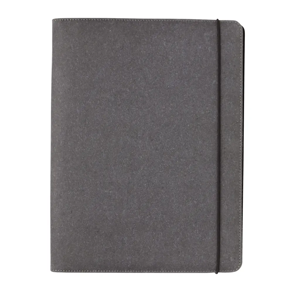 Ontdek onze gerecycleerde lederen portfolio A4, het ideale gepersonaliseerde relatiegeschenk voor uw marketingacties en events. Deze verfijnde map houdt uw documenten, kaarten en notities georganiseerd met een elastische band voor eenvoudig openen en sluiten. Binnenin vindt u een gelinieerd notitieblok van 64 g/m² gerecycled papier met 20 pagina's, plus één groot insteekvak, drie kleinere vakken en vier compartimenten voor visitekaartjes.