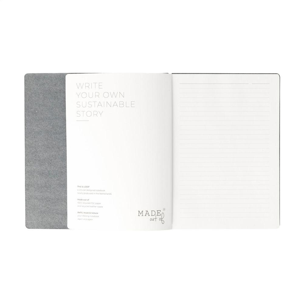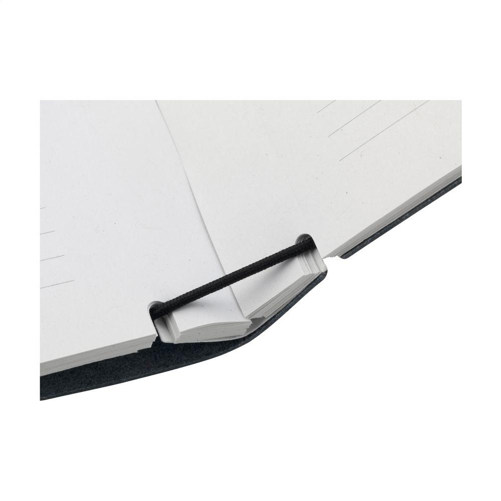 A5-notitieboekje van het merk MADE out of met een omslag gemaakt van restjes van de eigen recycled textiel producties: 70% denimafval, 25% bindmiddelen en 5% plantaardige toevoegingen. Dit notitieboekje met sluitelastiek, heeft een losse, uitneembare, hervulbare inhoud (Reuse & Reduce) bestaande uit ca. 120 vel/240 pagina's gelinieerd, gerecycled papier. De inhoud wordt op zijn plaats gehouden met een stevige elastiek. De omslag heeft een fijne, maar toch cool ogende structuur. De fijne vezels maken het flexibele materiaal vergelijkbaar met echt leer. Het is 100% recyclebaar en kan herhaaldelijk worden hergebruikt. Door het gebruik van oud denim heeft de omslag een blauwe kleur. Een recyclebaar product met een eigentijdse uitstraling. Handgemaakt. Dutch design. Made in Holland.