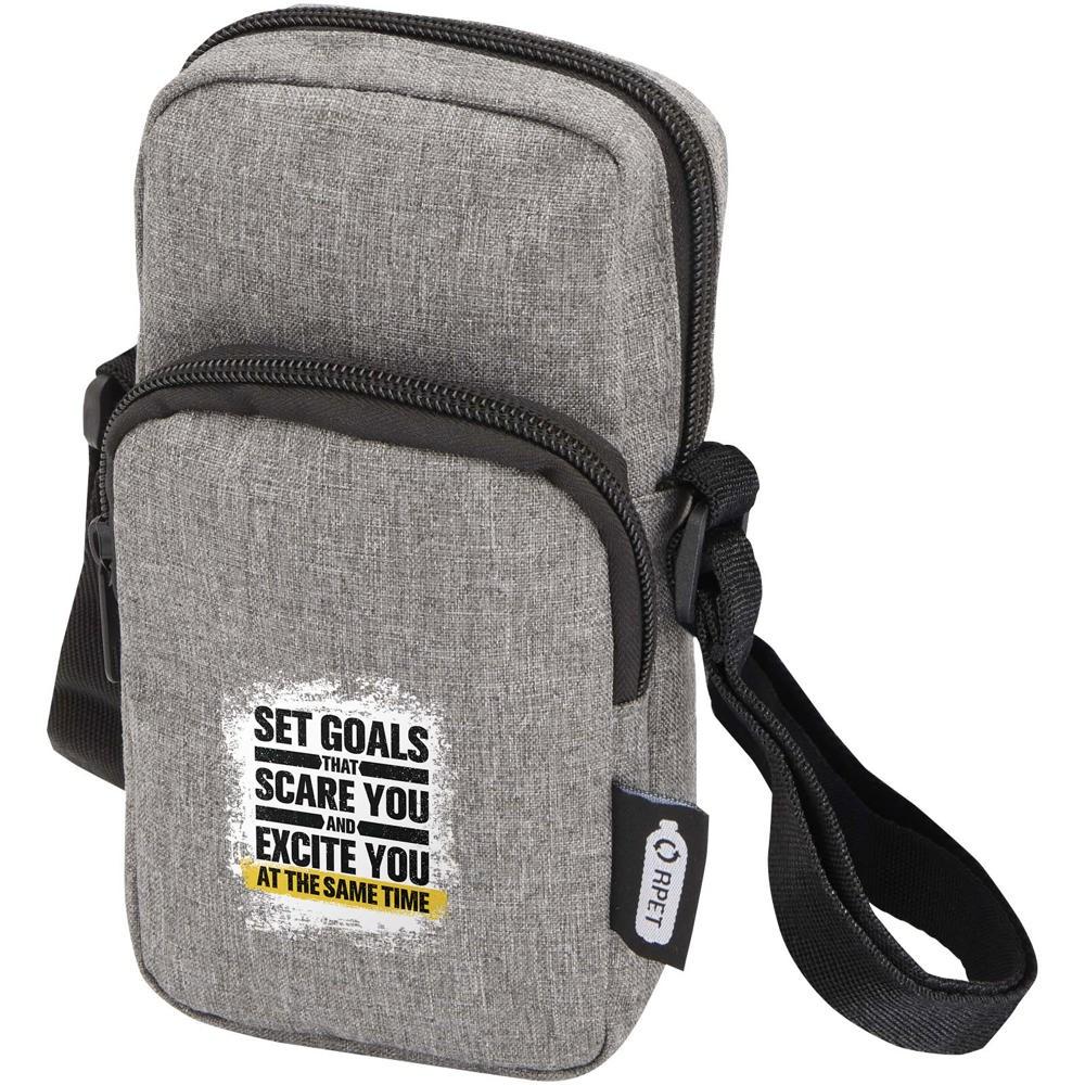 Ontdek deze GRS-gecertificeerde gerecycleerde crossbody tas, perfect als gepersonaliseerd relatiegeschenk voor je events of marketingacties. Je houdt je telefoon veilig in het hoofdcompartiment en geniet van handige extra opbergruimte dankzij het voorvak met ritssluiting voor kleine accessoires zoals sleutels of pasjes.