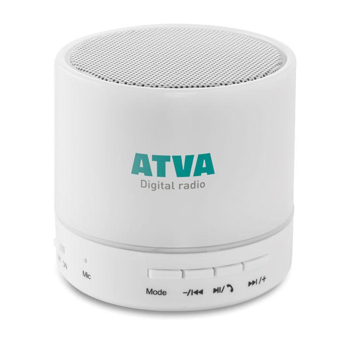 2.1 draadloze luidspreker van ABS met sfeerverlichting en LED indicatie. Inclusief 1 oplaadbare lithium 500 mAh batterij. Voorzien van een SD poort en een AUX/USB-kabel. Handsfree belfunctie. Output data: 3W, 4 Ohm.