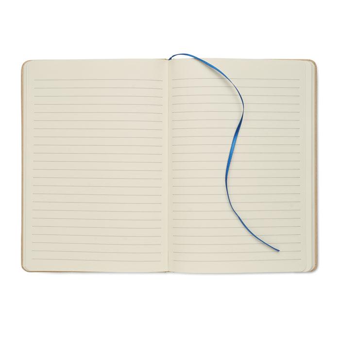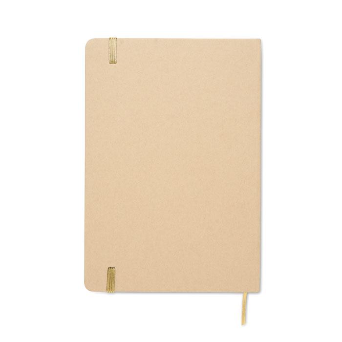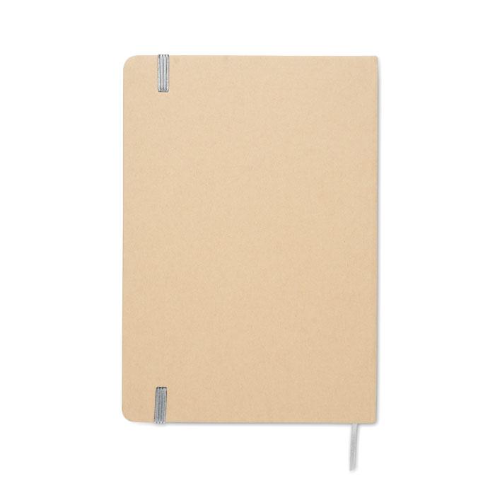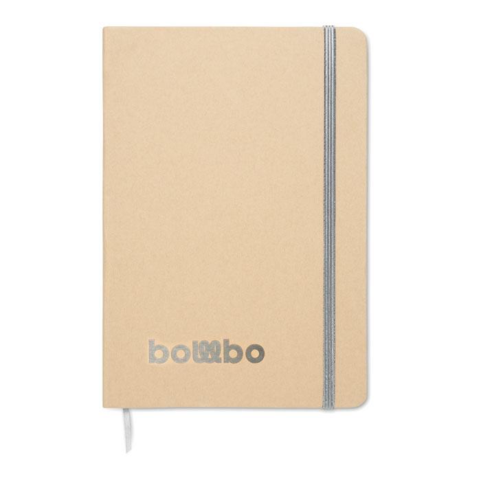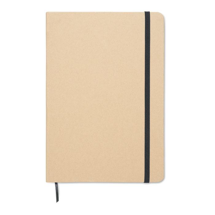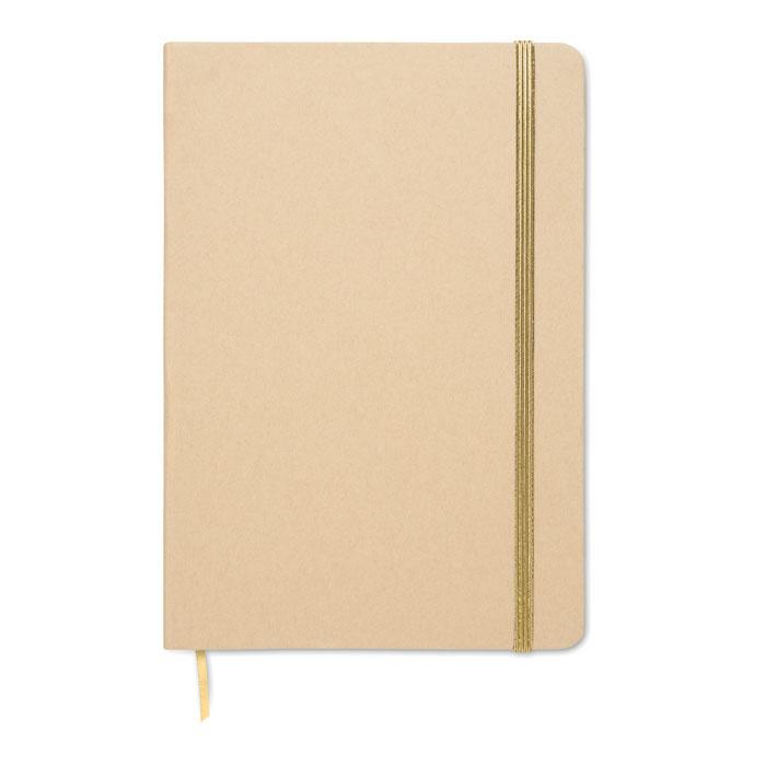 A5 notitieboekje met harde gerecycled kartonnen kaft. Beige kaft. Gebonden. 160 pagina's gelinieerd gerecycled papier (80 vellen). Elastische sluitingsband, bladwijzerlint in bijpassende kleur. Na lasergraveren komt de kleur tevoorschijn. FSC®-certified | FSC MIX CREDIT, P7.1, FSC-C213206
