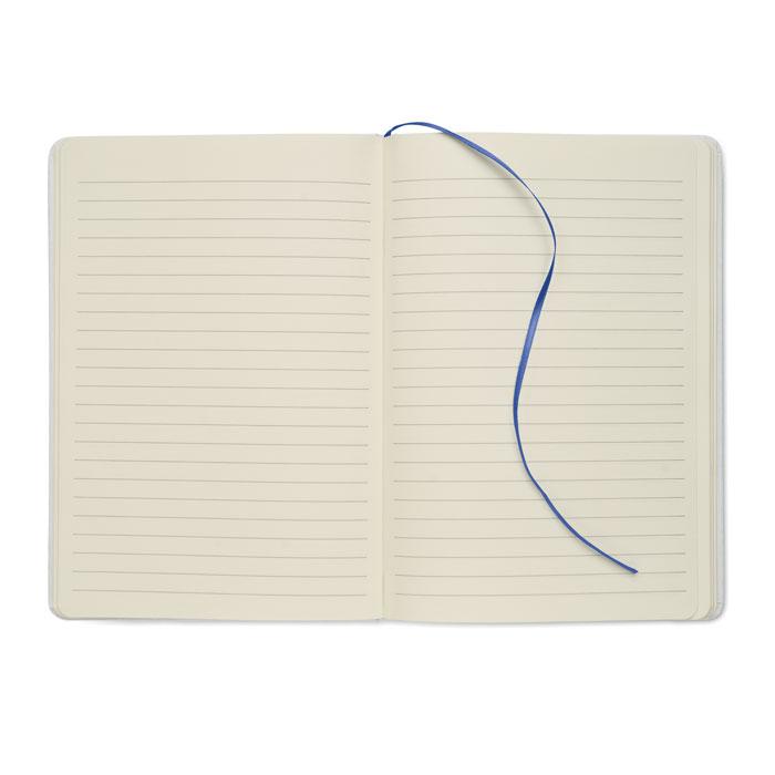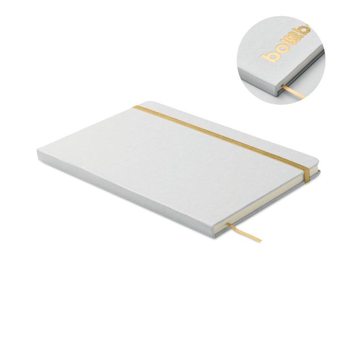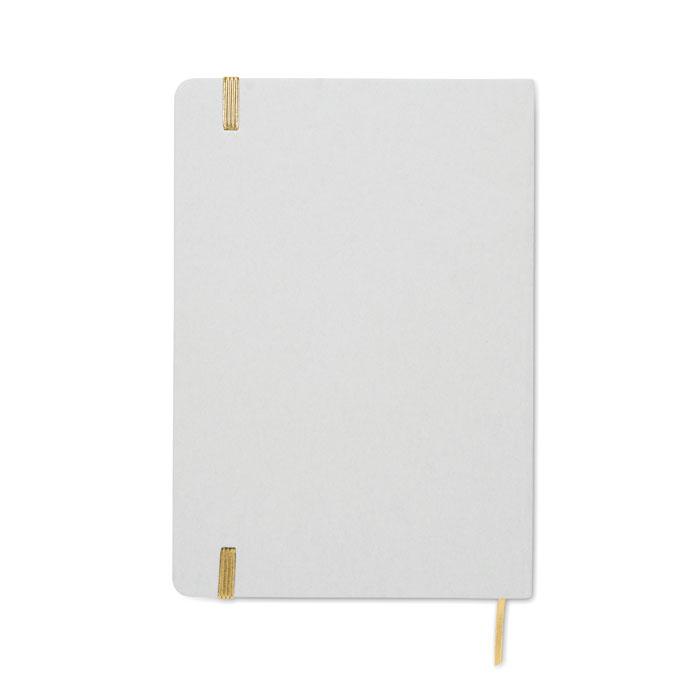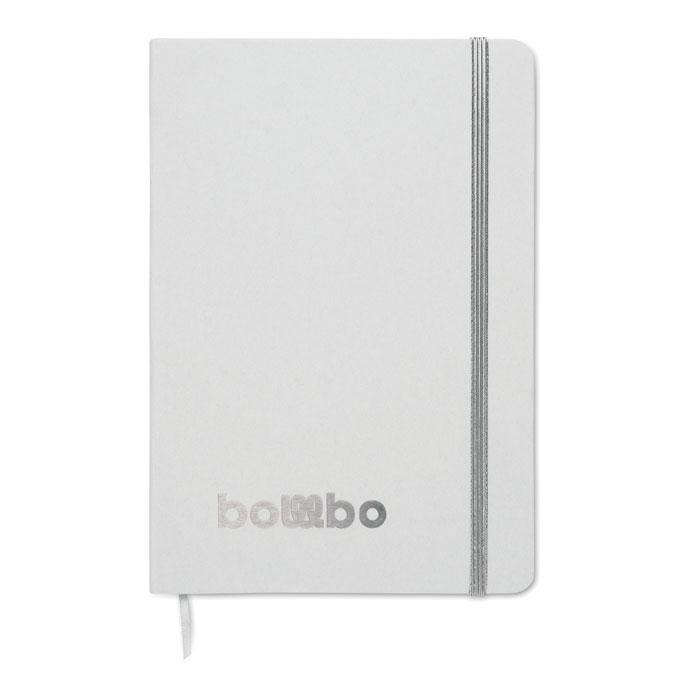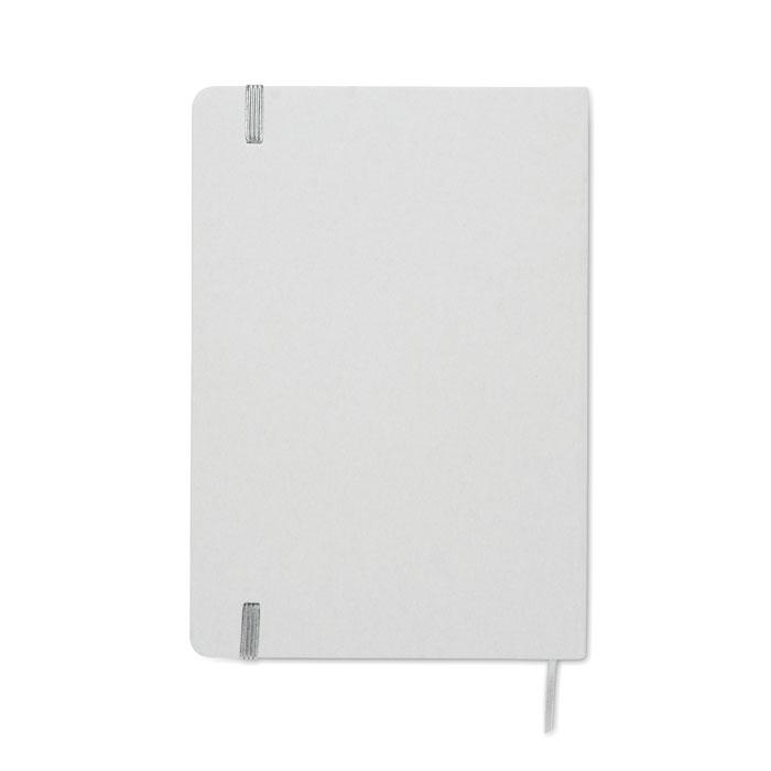 A5 notitieboekje met harde kaft gemaakt van 70% gerecycled melkpak en 30% gerecycled papier. Witte kaft. Gebonden. 160 pagina's gelinieerd gerecycled papier (80 vellen). Elastische sluitingsband, bladwijzerlint in bijpassende kleur. Na lasergraveren komt de kleur tevoorschijn.