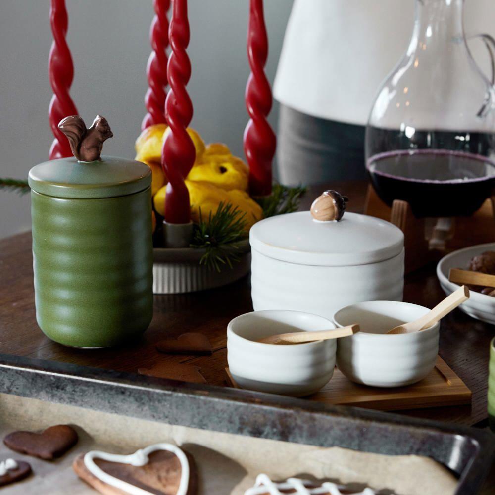 Ontdek deze elegante Sagaform Ellen set: twee steengoed kommetjes, compleet met twee bamboe lepeltjes en een handig bamboe tray. De typisch Scandinavische look maakt het ideaal als decoratief relatiegeschenk of voor dagelijks genot bij je favoriete drankje.