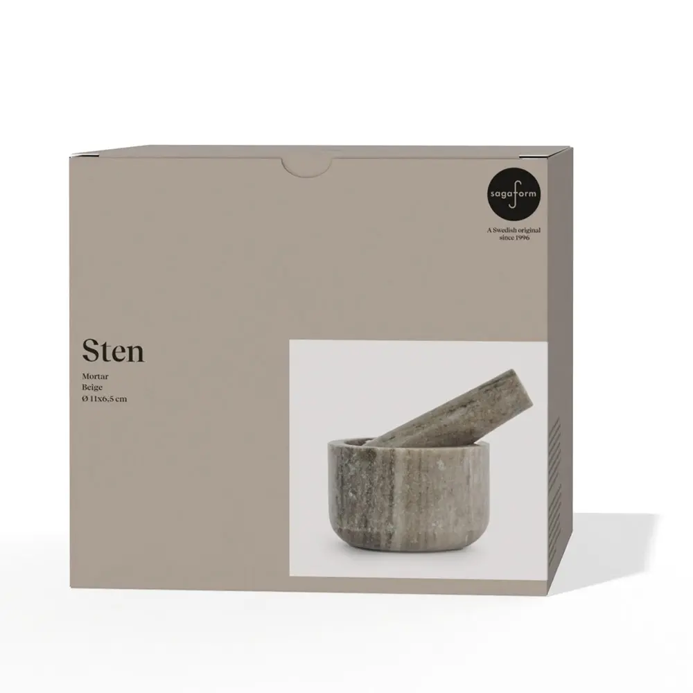 De Sagaform Sten vijzel van travertijnmarmer is een elegant en duurzaam relatiegeschenk dat uw merk optimaal promoot. Met een diameter van 110 mm past dit compacte accessoire perfect in elke keuken, ideaal voor het malen van kruiden in soepen, sauzen en marinades. Gemaakt van slijtvast en hittebestendig travertijnmarmer, biedt het langdurig gebruiksgemak en behoudt het zijn aantrekkelijke uitstraling dankzij de krasbestendige afwerking.