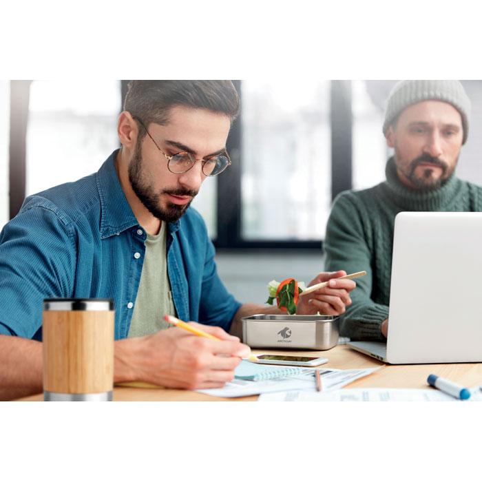 Ontdek deze praktische rvs lunchbox van 600 ml met bamboe deksel, compleet met mes, vork en afneembaar polyester sluitelastiek. Je krijgt een duurzame en stijlvolle oplossing voor maaltijden onderweg, perfect als gepersonaliseerd relatiegeschenk met jouw logo.
