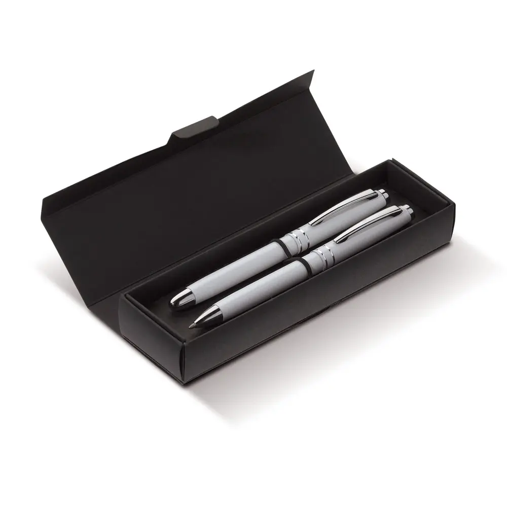 Ontdek deze elegante metalen schrijfset, bestaande uit een balpen en een rollerball, ideaal als gepersonaliseerd relatiegeschenk voor uw bedrijf. Met de twistfunctie bij de balpen en de praktische dop bij de rollerball biedt deze set gebruiksgemak en een professionele uitstraling. De stijlvolle schuine bovenkant met zilverkleurige accenten zorgt voor een verfijnd design dat indruk maakt.