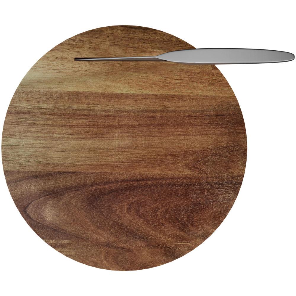 Je ontvangt een ronde snijplank van 30 cm diameter en 4 cm hoogte, voorzien van een handig inzetstuk (30,4 x 4 x 2 cm) waar het mes na gebruik netjes in opgeborgen wordt. Ideaal voor keukenplezier en duurzaam gebruik.