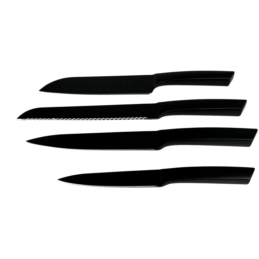 Ontdek deze praktische set van 4 keukenmessen en een houten snijplank (18 x 21,4 x 3 cm), perfect als gepersonaliseerd relatiegeschenk. De set bevat een broodmes (20 cm), Santoku-mes (17,8 cm), vleesmes (17,8 cm) en hobbymes (12,7 cm).