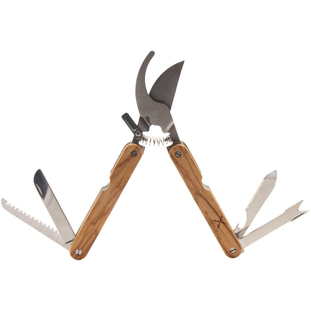 Je ontvangt een premium set van twee multi-tools: een veelzijdige 10-in-1 hamer/tang en een handige 6-in-1 snoeischaar. Beide gemaakt van robuust roestvrij staal en authentiek Italiaans olijfhout voor een duurzame en elegante uitstraling. Alles netjes verpakt in een gerecyclede kartonnen geschenkdoos.