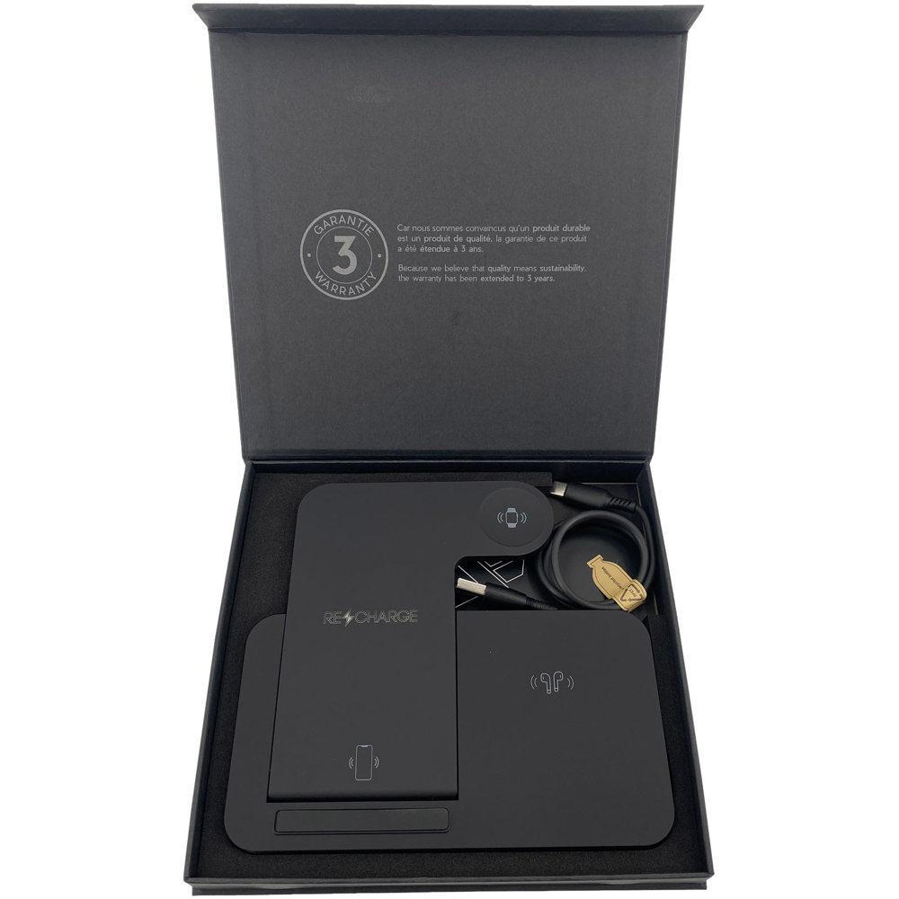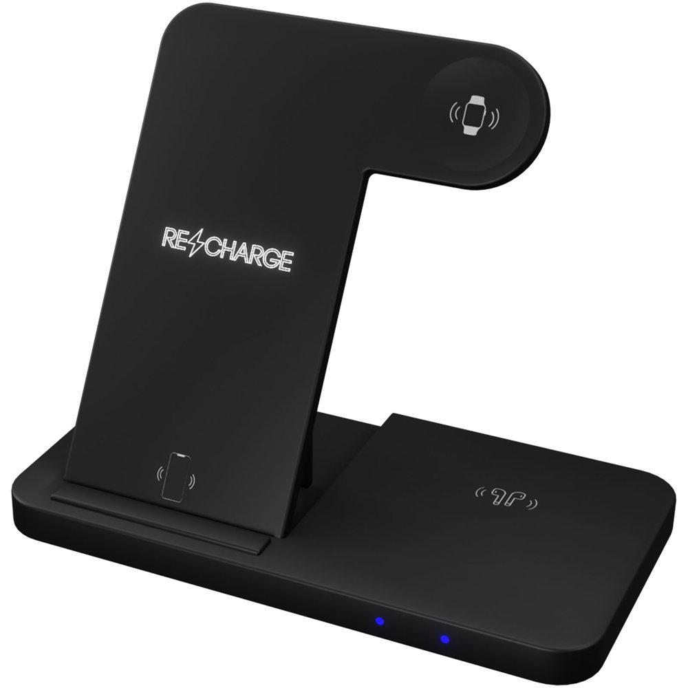 Ontdek dit opvouwbare 3-in-1 draadloos oplaadstation van gerecycled plastic, perfect als relatiegeschenk voor jouw bedrijf. Je laadt tegelijkertijd je smartphone (15 W), oordopjes (5 W) en smartwatch (2 W) op, terwijl het ook dient als handig telefoonstandaard.