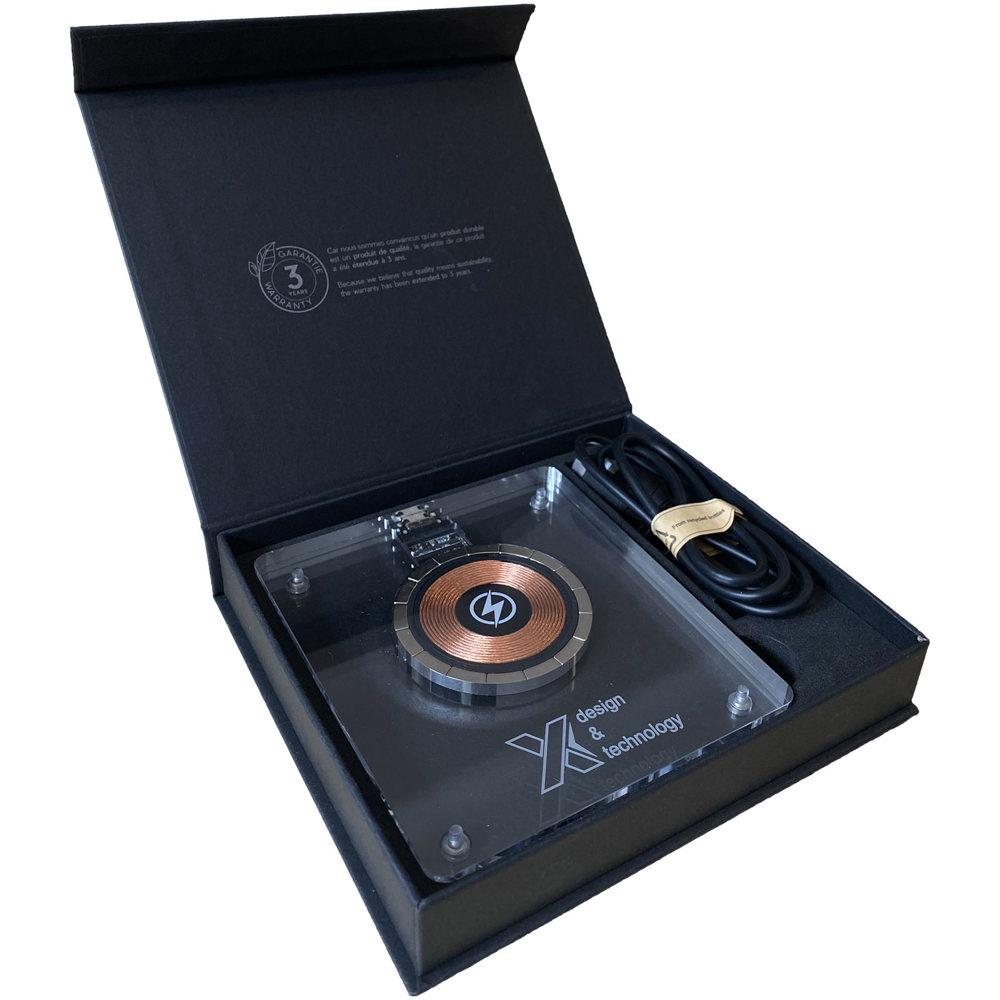 Dit compacte oplaadstation (11,5 x 10 x 1,5 cm) komt in een luxe geschenkverpakking met magnetische sluiting, ideaal als gepersonaliseerd relatiegeschenk met jouw logo. De duurzame rPET-oplaadkabel maakt het helemaal af voor bewuste bedrijven.