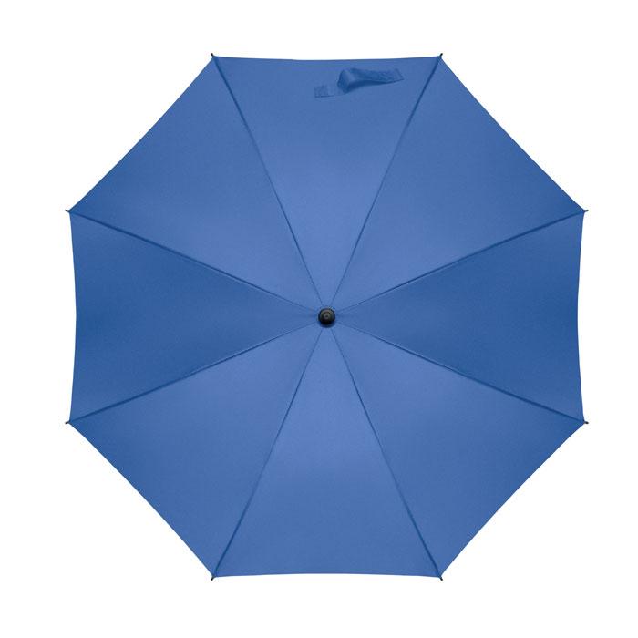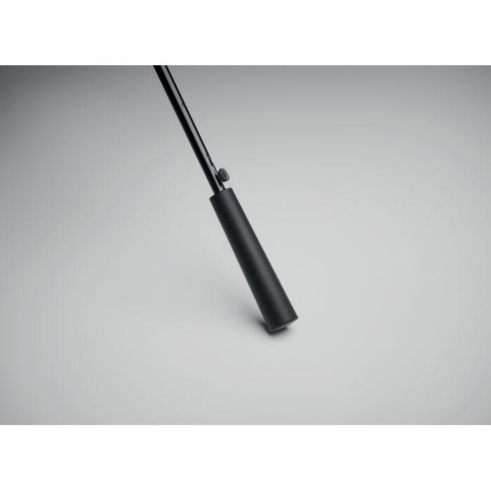 23 inch automatisch openende windbestendige paraplu van 190T pongee met glasvezel frame en zwart beplate metalen steel en kunststof uiteinden. ABS handvat met rubberen afwerking. Handmatige sluiting.