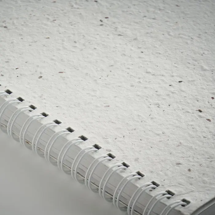 Ontdek ons SEED RING A5 notitieboekje met zaadpapier kaft, ideaal als gepersonaliseerd relatiegeschenk voor uw marketingcampagnes of events. Dit dubbel gebonden notitieboek biedt 200 gerecyclede gelinieerde pagina's (100 vellen) uit duurzaam papier, perfect voor nootjes en ideeën tijdens vergaderingen.