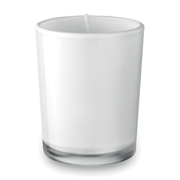 Geurkaarsje in gekleurd glas. 50 g. (03)sandal wood sandal wood geur (06) white linen geur