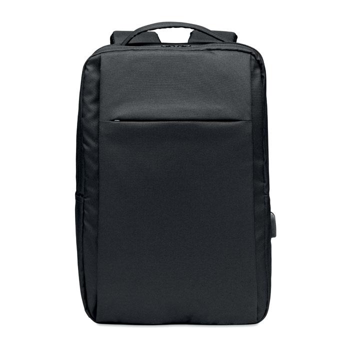 Ontdek deze duurzame laptop rugzak van 300D RPET polyester, perfect als gepersonaliseerd relatiegeschenk voor jouw bedrijf. Met gewatteerde schouderbanden zit hij comfortabel, zelfs bij lang dragen tijdens events of dagelijks gebruik. Het ruime hoofdvak past moeiteloos een 15 inch laptop, en de geïntegreerde USB-oplaadkabel houdt je apparaten altijd powered.