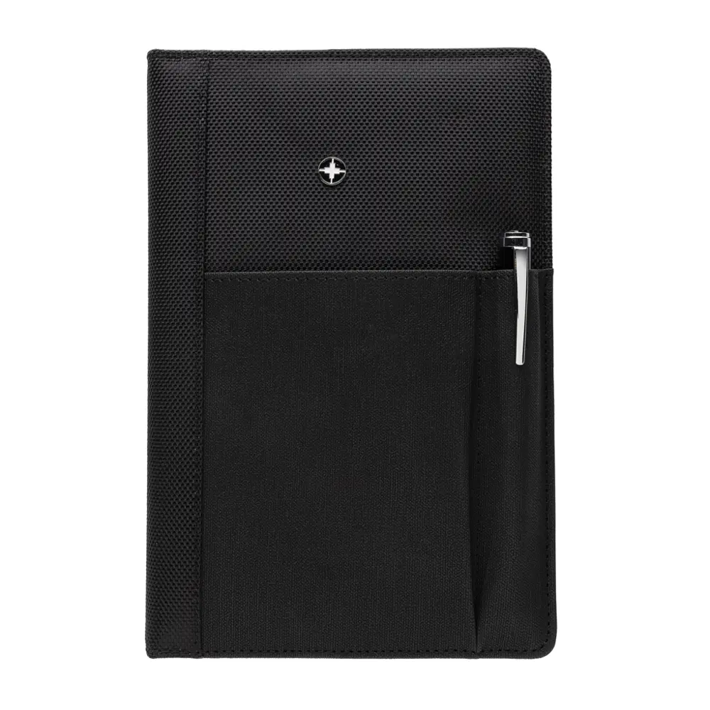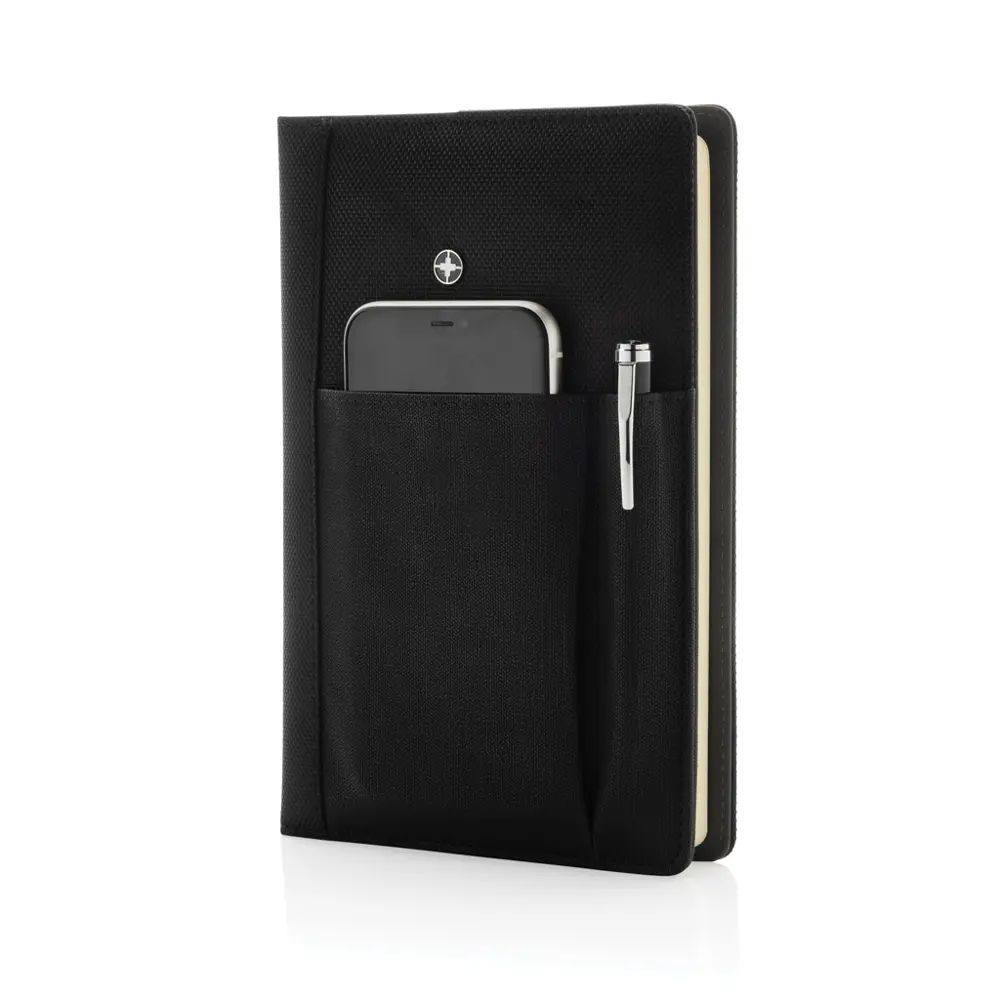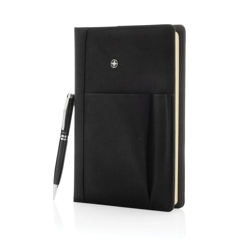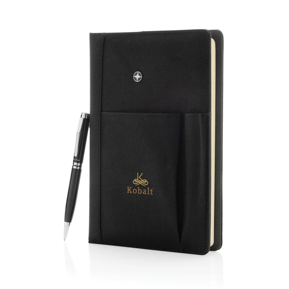 Ontdek ons Executive notitieboek met pen, ideaal als gepersonaliseerd relatiegeschenk voor uw bedrijf. De stevige omslag van 1680D en 600D polyester biedt bescherming en bevat een handig voorvak voor pen, kaarten, contant geld of uw mobiele telefoon. Inclusief een vervangbaar A5-notitieboek met 192 gelinieerde pagina's van 80 g/m² papier, zodat u flexibel kunt noteren.