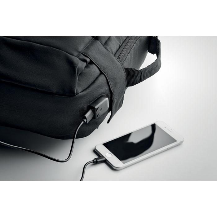 300D RPET polyester laptop rugzak met gewatteerde schouderbanden, een groot hoofdvak geschikt voor 15 inch laptops en een USB oplaadkabel.
