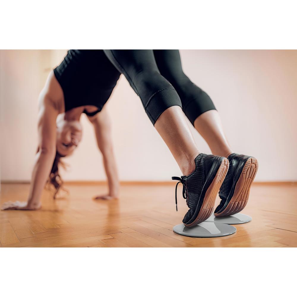 Ontdek de slidepads voor een optimale full-body workout. Je stabiliseert constant je kern, wat de training bijzonder effectief maakt. Deze dubbelzijdige glijschijven zijn veelzijdig: gebruik de gladde kunststofkant op tapijten en de schuimkant op harde vloeren zoals hout of tegels.