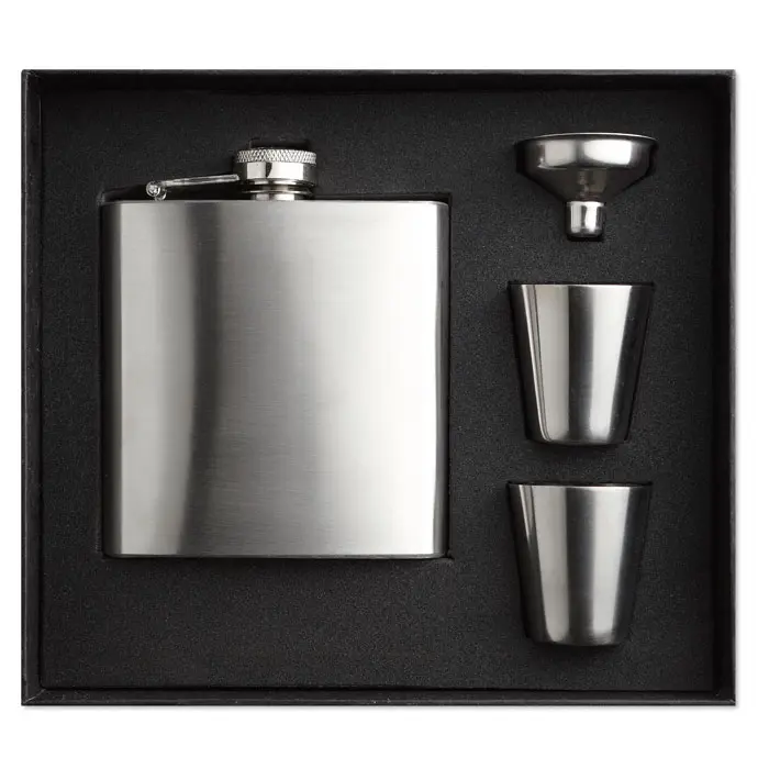 Deze enkellaagse heupfles heeft een capaciteit van 175 ml en is vervaardigd uit roestvrij staal voor duurzaamheid en hygiëne. Ze wordt geleverd met twee handige bekertjes en een schenktuit voor eenvoudig en discreet gebruik. De set is verpakt in een geschenkverpakking, perfect voor een eerste indruk.