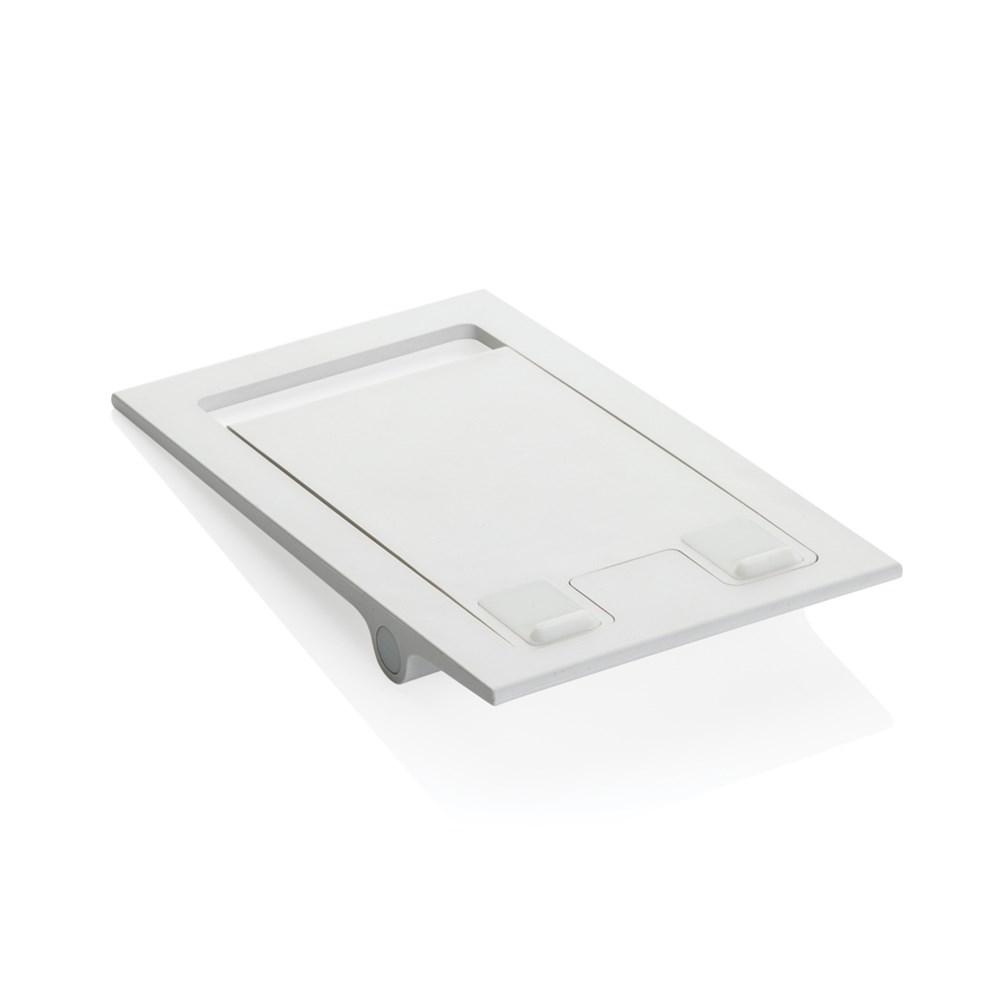 Platte en opvouwbare telefoonstandaard gemaakt van RCS gerecycled ABS. De standaard wordt plat en opgevouwen geleverd en kan worden uitgevouwen tot een telefoonstandaard die telefoons van alle formaten kan dragen. De standaard is sterk genoeg om de kijkhoek aan te passen. Met siliconen demping om je telefoon in optimale conditie te houden. Totaal gerecycled materiaal: 85% op basis van het totale gewicht van het item. RCS-certificering zorgt voor een volledig gecertificeerde toeleveringsketen van de gerecyclede materialen. Verpakt in FSC®-verpakking. PVC-vrij.