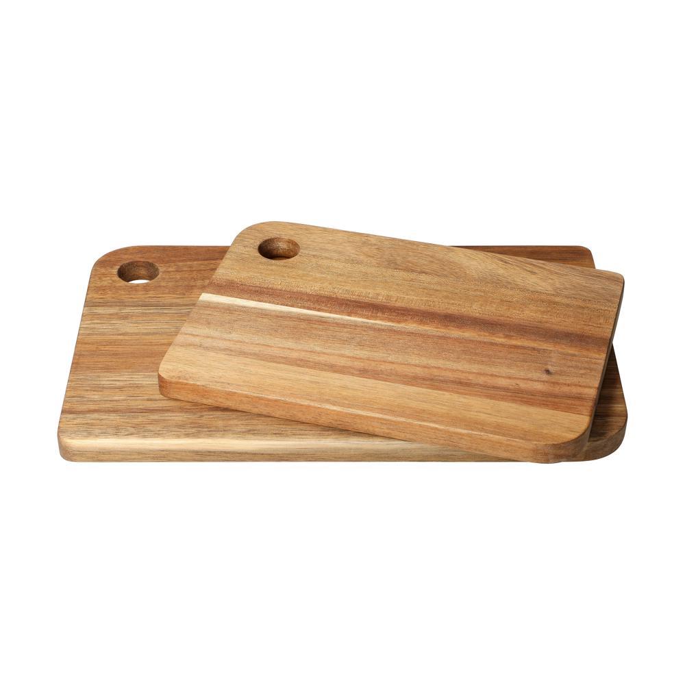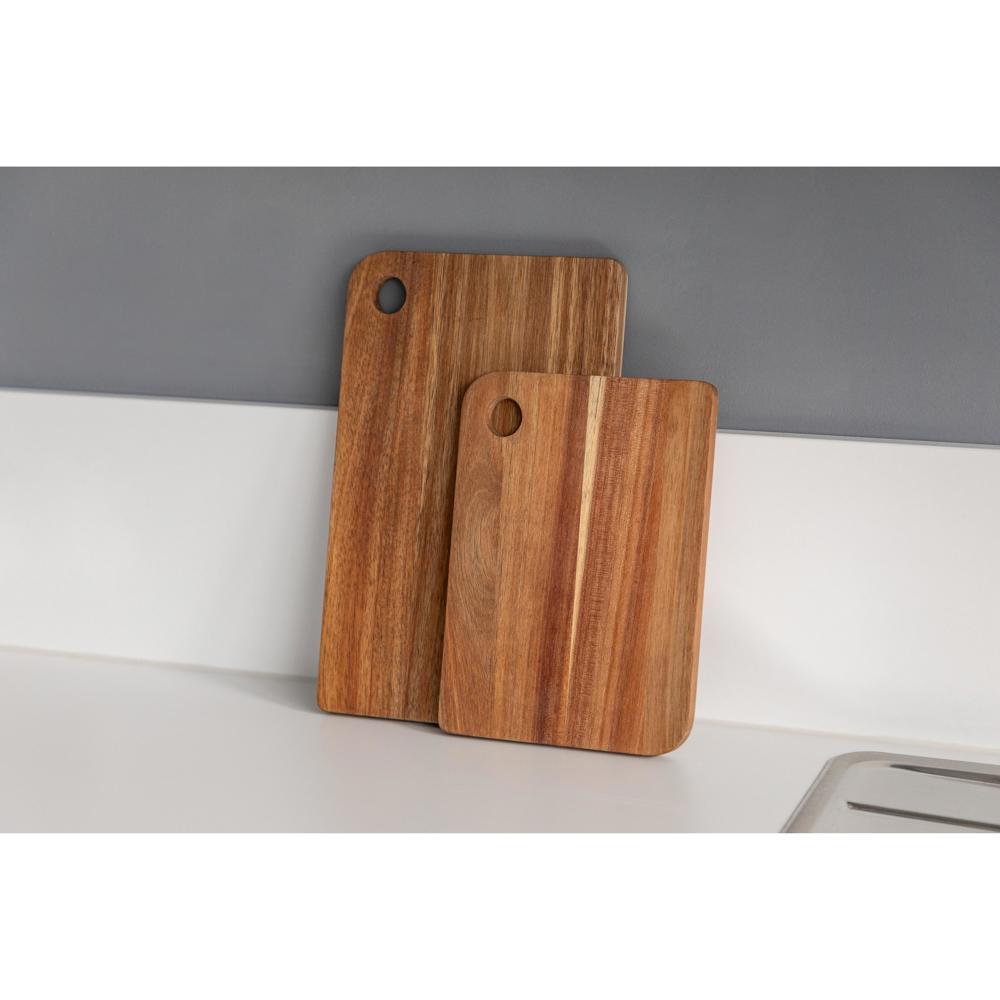Ontdek deze robuuste snijplank van hoogwaardig acaciahout (24,5 x 17,5 cm, 15 mm dik). Voorbehandeld met sojaolie voor extra bescherming en een mooie nerf. Het handvatgat maakt hanteren en opbergen superhandig.