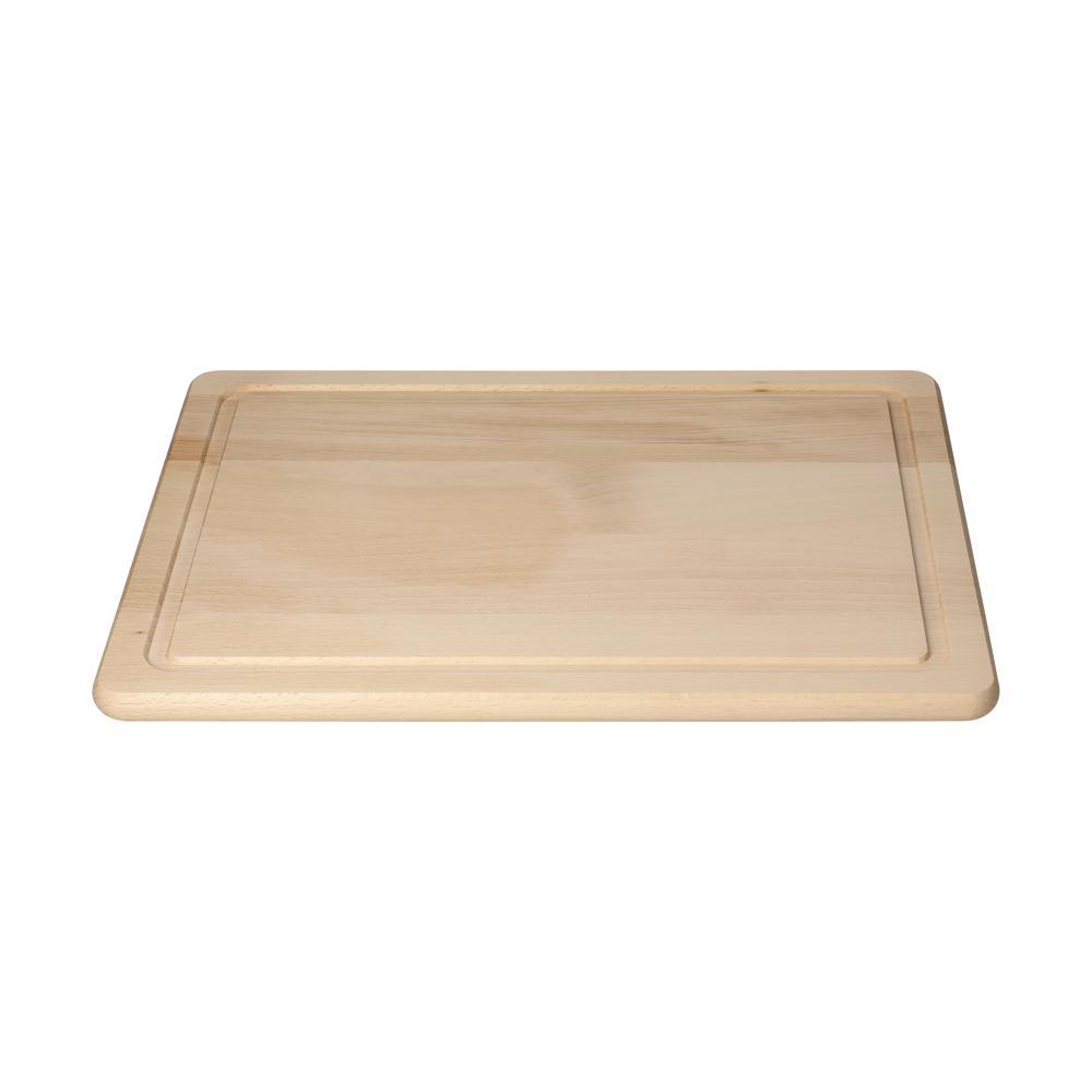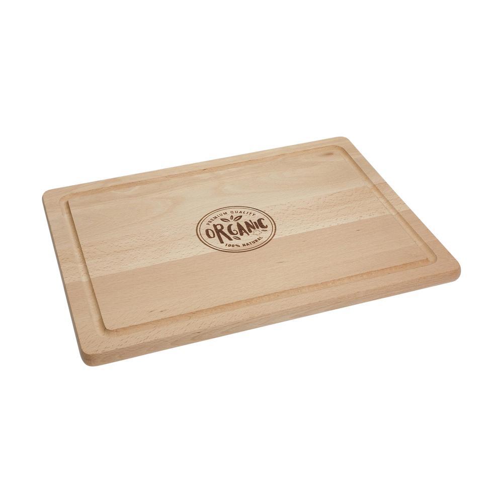Daar past heel wat op. Enorm snij- of borrelplank van 15 mm dik beukenhout (onbehandeld). Met gefreesde groef aan de rand om het weglopen van vloeistoffen te voorkomen. Uitsluitend met de hand afwassen.