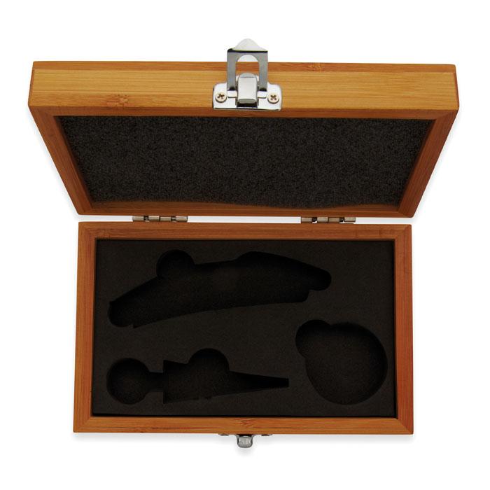 Wijnset in bamboe doosje met een kurkentrekker, wijnring en stop van roestvrijstaal en bamboe.