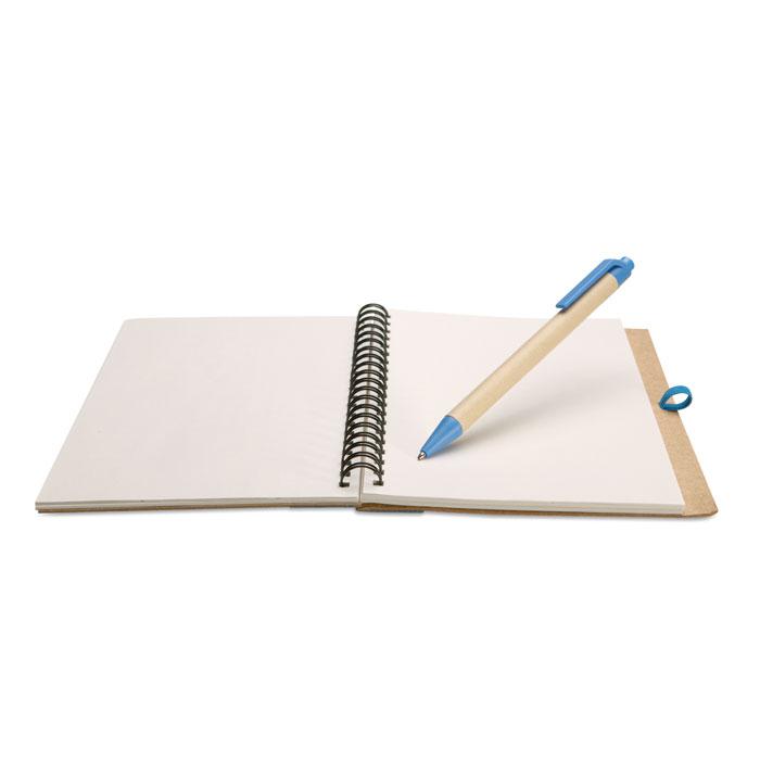 Ontdek dit duurzame notitieblok met bijbehorende balpen, perfect als relatiegeschenk voor jouw events of promoties. Het notitieblok bevat 140 gerecyclede blanco pagina's (70 vellen) voor al je notities, en de balpen is gemaakt van gerecycled karton met biologisch afbreekbare kunststof onderdelen.