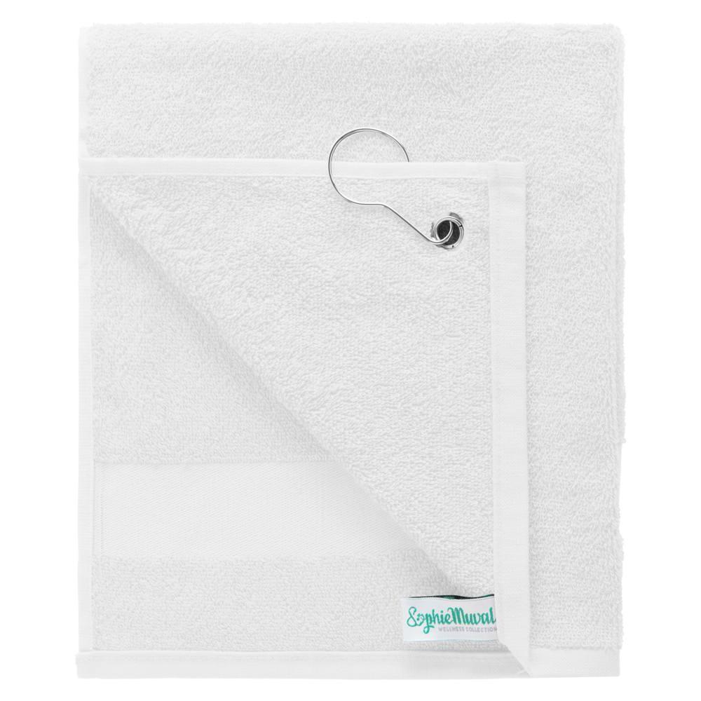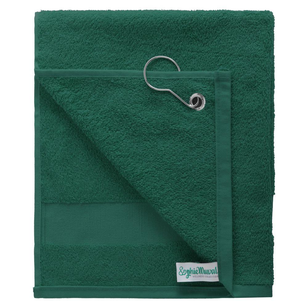 Sophie Muval golfhanddoek 55x30 cm, 450 gr/m². 100% katoen. Beschikt over één band van 4 cm hoog en een ophangclip.