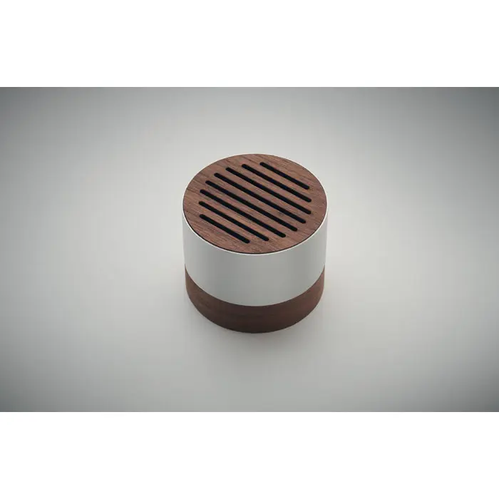Ontdek deze duurzame draadloze luidspreker, vervaardigd uit gerecycled aluminium met een elegante walnoothouten basis en bovenkant. Deze speaker biedt uw bedrijf een milieuvriendelijke manier om relaties te versterken en uw merk te promoten tijdens events of als relatiegeschenk.