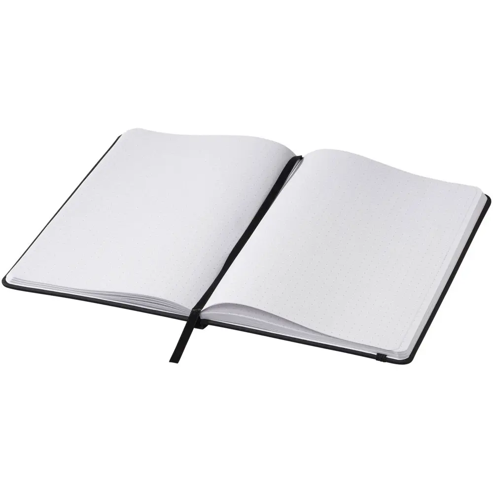 Dit A5 notitieboek biedt een praktische oplossing voor uw marketing- en eventbehoeften. Met een elastische sluiting en bijpassend lint zorgt het voor veilig opbergen van notities. Het bevat 96 vellen papier met 60 g/m², voorzien van gestippelde lijntjes voor nauwkeurige aantekeningen.