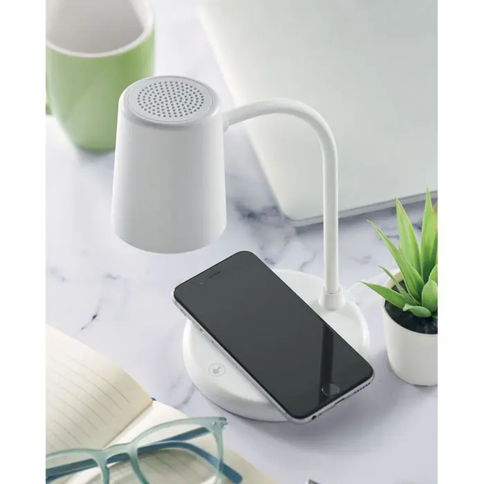Ontdek onze veelzijdige lamp met geïntegreerde oplader en speaker, ideaal als gepersonaliseerd relatiegeschenk voor uw marketingcampagnes of events. Deze praktische oplossing combineert verlichting, opladen en audio in één compact apparaat, perfect voor ondernemingen die hun merk willen promoten bij klanten.