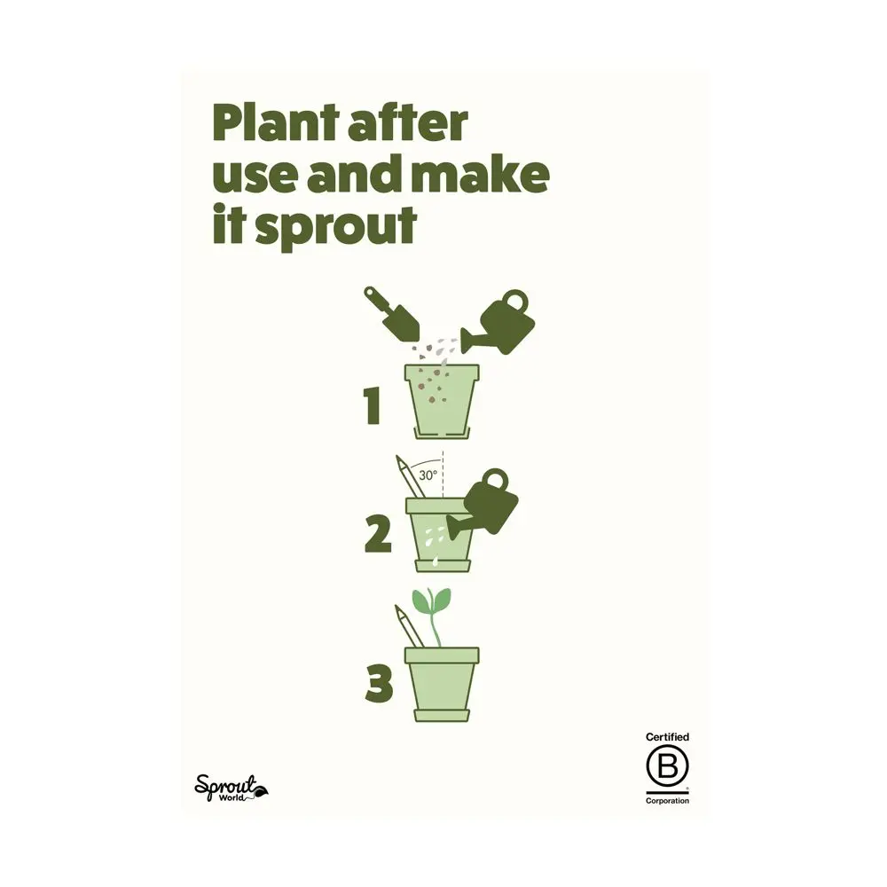 Wanneer het potlood op is, plant u het eenvoudig in de aarde: na 2-3 weken ontkiemen de zaadjes en groeit het uit tot een levend aandenken. Ideaal voor marketingcampagnes of events, want dit product combineert functionaliteit met ecologische verantwoordelijkheid, wat uw bedrijf positioneert als duurzaam en attent.