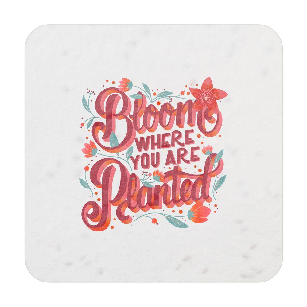 Personaliseer deze vierkante onderzetters van biologisch afbreekbaar zaadpapier (80 g/m²) met full colour opdruk op één zijde. Stem de print perfect af op je merk of boodschap, en voeg optioneel een opdruk toe op de tweede zijde. Kies uit zaden van bloemen, kruiden of groenten.