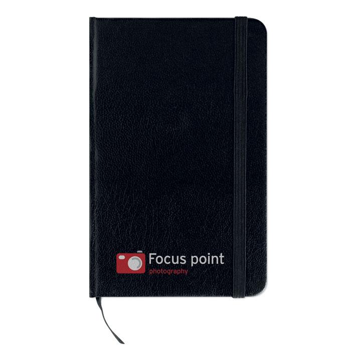 A5 notitieboek met harde PVC kaft. Ingebonden. 192 pagina's van gerecycled ruitjes papier (96 vellen). Bijpassende elastische sluitingsband en bladwijzer met lint.