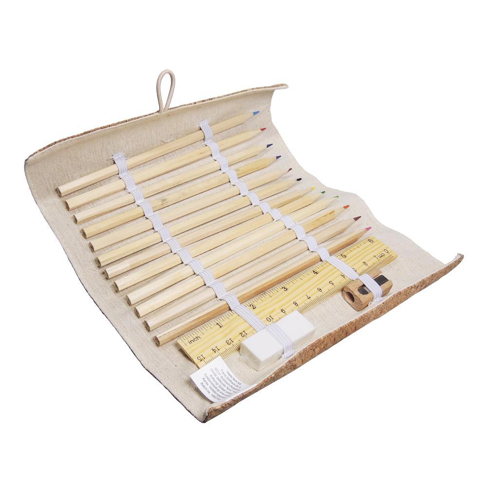 Ontdek deze flexibele pennenrol bekleed met natuurkurk, ideaal als gepersonaliseerd relatiegeschenk voor je events en promoties. Je ontvangt een praktische rol met binnenkant van zachte stof, compleet uitgerust met een gum, puntenslijper, houten liniaal en 12 kleurpotloden van onbewerkt hout. De overslag houdt alles netjes op zijn plaats en voorkomt dat benodigdheden eruit vallen. Sluit hem eenvoudig met een knoop en elastische lus.
